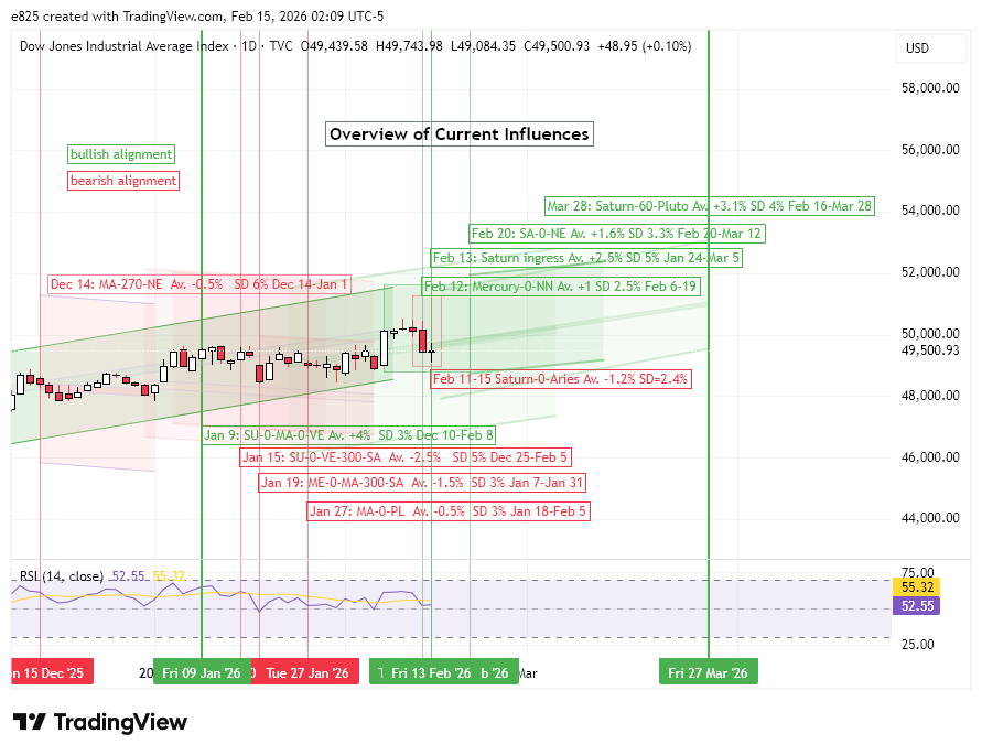 The combined effects of the Saturn ingress into Aries and the Mercury-North Node conjunction may well be enough to take stocks higher this week. That is far from certain, however, as the effect sizes are fairly small and could be offset by other unknown influences. But with Friday’s Saturn-Neptune conjunction, there will be an additional bullish influence starting next week which will serve to further support prices and perhaps fuel another higher high. However, that influence will only begin after Friday, Feb 20.