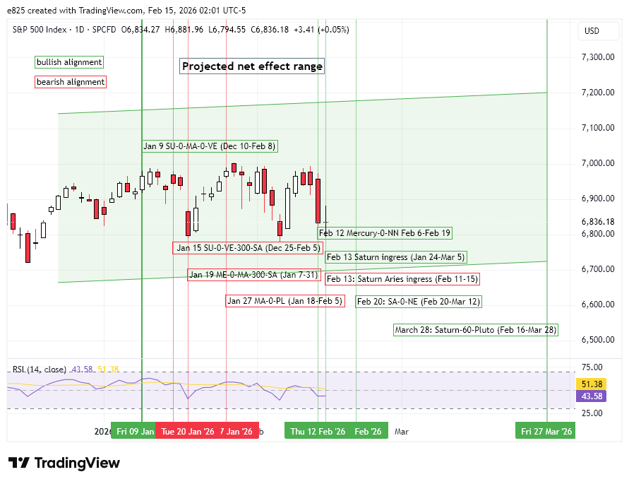 The pullback coincided closely with the ingress of Saturn into tropical Aries on Friday, Feb 13. Indeed, Thursday’s sell-off occurred just one day before Saturn changed signs — a fairly strong correlation as these things go. While I thought we would see some downside last week with the Saturn ingress, I was unsure to what extent it might be offset by the bullish influence of the conjunction of Mercury and the North Lunar Node on Feb 12.