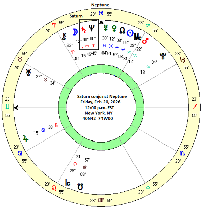 The combined effects of the Saturn ingress into Aries and the Mercury-North Node conjunction may well be enough to take stocks higher this week. That is far from certain, however, as the effect sizes are fairly small and could be offset by other unknown influences. But with Friday’s Saturn-Neptune conjunction, there will be an additional bullish influence starting next week which will serve to further support prices and perhaps fuel another higher high. However, that influence will only begin after Friday, Feb 20.