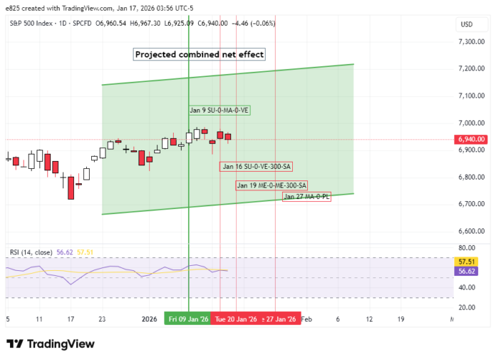The upward sloping green channel uses darker shading and reflects the greater price effect and lower standard deviation (1 SD = 3%) of the Jan 9 triple conjunction of Sun-Mars-Venus. This is a stronger bullish effect than either of the bearish alignments (Sun-Venus-Saturn; Mercury-Mars-Saturn) and thus may well remain the dominant influence in the coming weeks. I would note, however, that I have included an additional alignment (vertical line) on January 27, namely the Mars-Pluto conjunction (MA-0-PL). I have pre-emptively colored this red as I suspect it may coincide with some bearishness. Interestingly, this conjunction occurs just one day before the next FOMC meeting – a potential market mover. However, I have not yet crunched the numbers for this conjunction so it remains a question mark for now. That will be the focus on my next post.