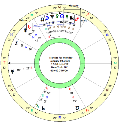 Just as the Sun and Venus aligned with Saturn last week, this week Mercury and Mars will form their own conjunction and thus enter into a similar sextile aspect with Saturn. The closest alignment occurs on Monday, January 19, although the Mars-Saturn sextile is exact the following day on January 20.