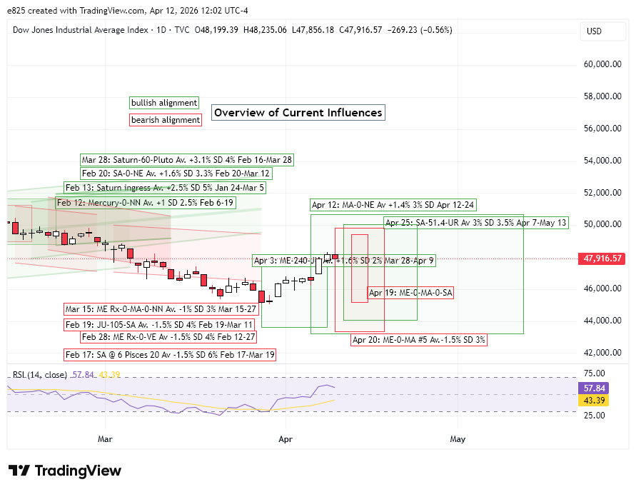 The bullish influence Saturn-Uranus septile is unlikely to have any direct impact on stocks this week.  Its effective influence is more likely to manifest closer to its alignment date of April 25, especially after April 19 which was the start date to the most bullish 12-day interval (“-6d 6d”).