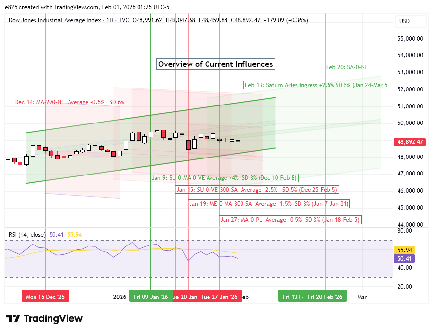 Next week, we will take a look at the probable impact of the Saturn-Neptune conjunction that is exact on Feb 20. My preliminary analysis suggests that this could be a bullish influence and thus it has been drawn in green on the DJIA current influences chart.