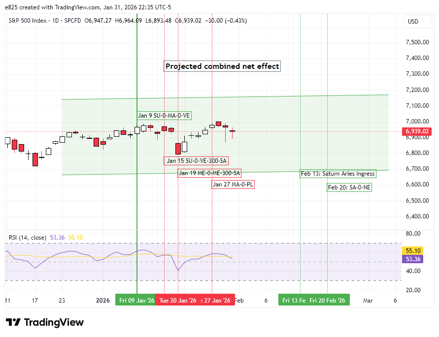 Alas, assigning influence to single alignments is more straightforward than combining multiple simultaneous alignments and arriving an overall net effect. Nonetheless, I have attempted to do that here with the S&P 500 projected combined net influence chart. Given the probable bullish influence of the Saturn ingress, I have extended the rising green channel into early March. However, I have also flattened the upward angle of the channel somewhat to reflect the effect of some potential dips along the way.