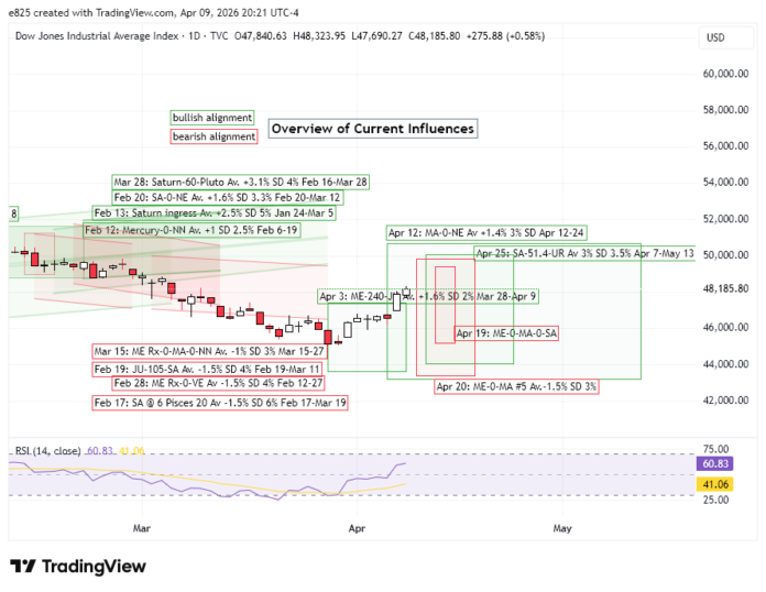 After this week’s powerful rally, the approach of the April 20 Mercury-Mars conjunction is another reason why would we could see some downside next week. The updated cumulative trend chart has a clear bearish bias which may or may not shape market direction in the coming days. Nonetheless, it is a negative influence that would require some significant bullish offset if the market rally is to continue.